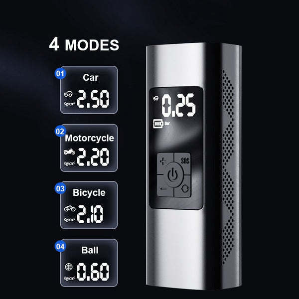 The wireless design and compact mini size make the air compressor easy to carry and can be operated with one hand. In just 4 steps, the compressor is ready. The LCD display shows the air pressure. It is suitable for inflating car tires when the tires are insufficient, and fully inflating bicycle and motorcycle tires