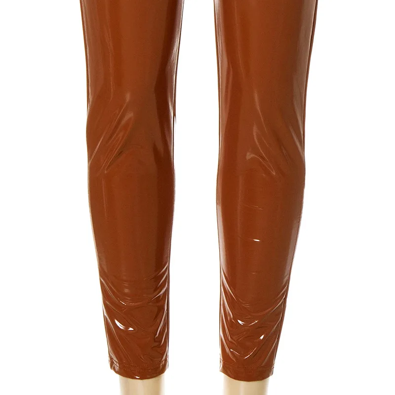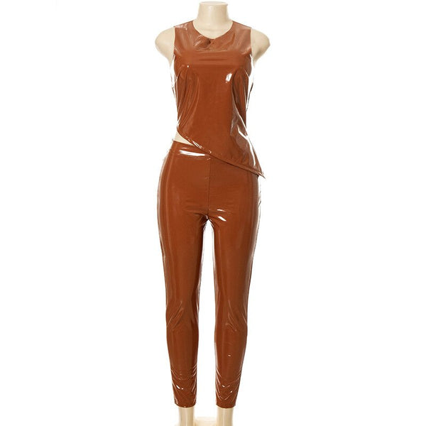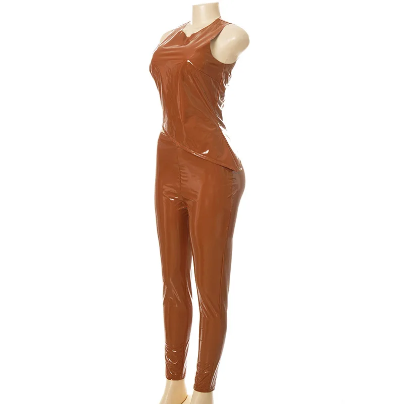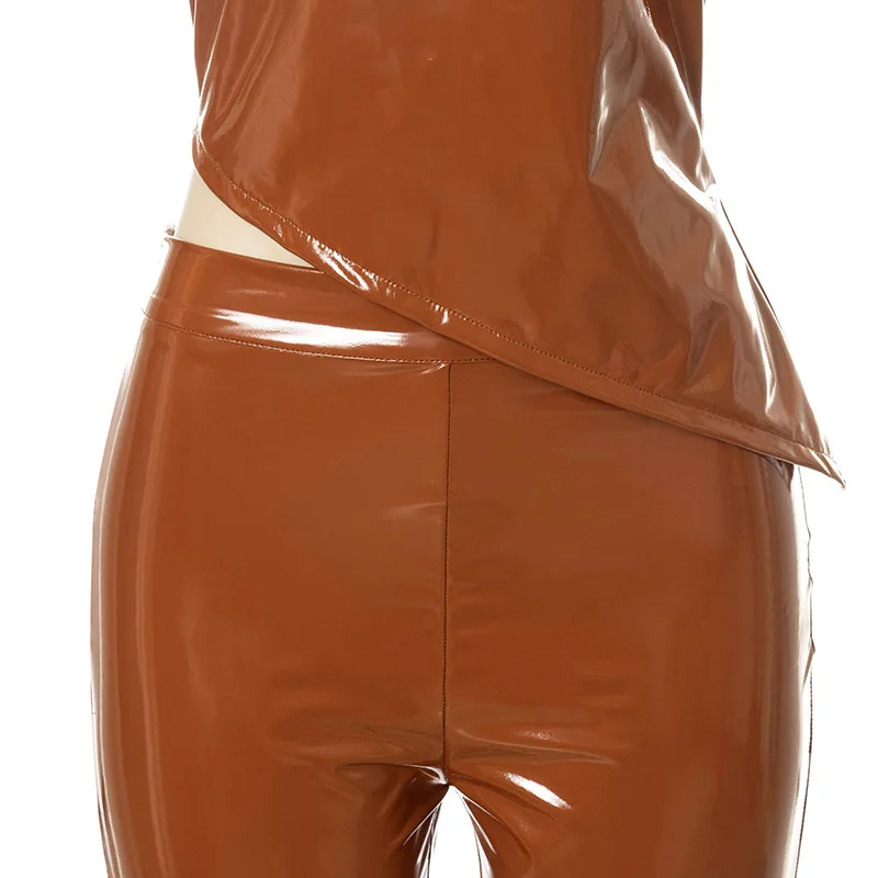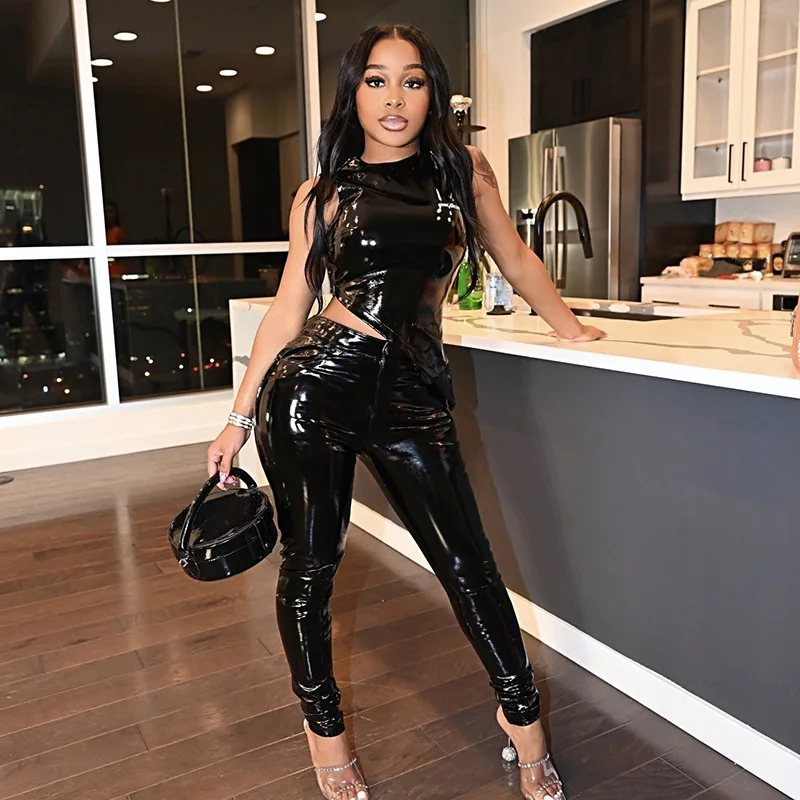 Skinny PU Leather Club Outfits Sexy Women Two Pieces Party Matching Set Side